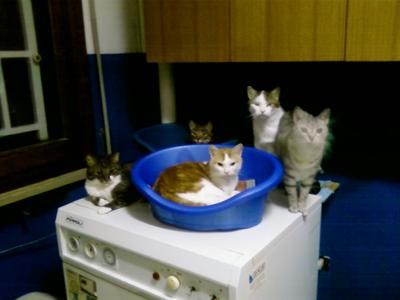 A sx in basso Tigro,il capo,5 anni; a dx nello scatolino blu chiaro Red,il coccolone,12 anni; dietro da sx nello scatolino blu scuro Pepita,la schiva,4 anni; Macchia,il fifone,6 anni; Birba,l'intraprendente,11 anni.