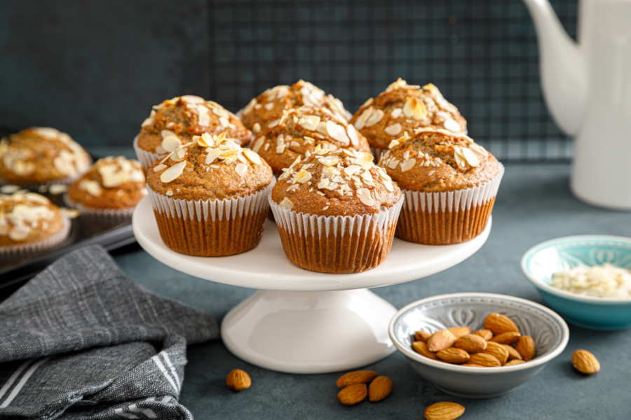 Riempire degli stampini da muffin con una cucchiaiata abbondante di impasto, aggiungere un cucchiaino di marmellata e ricoprire con un altro cucchiaio di impasto. Completare tutti gli altri stampini. Cospargere con lamelle di mandorle e infornare per circa 25 minuti.