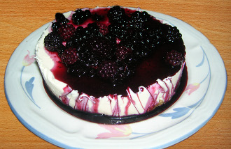 Sformare la tortina, tirando i lembi della pellicola (il fondo di biscotti deve rimanere nella parte inferiore), guarnire con i frutti di bosco fatti bollire per 2 minuti con un cucchiaio di acqua.